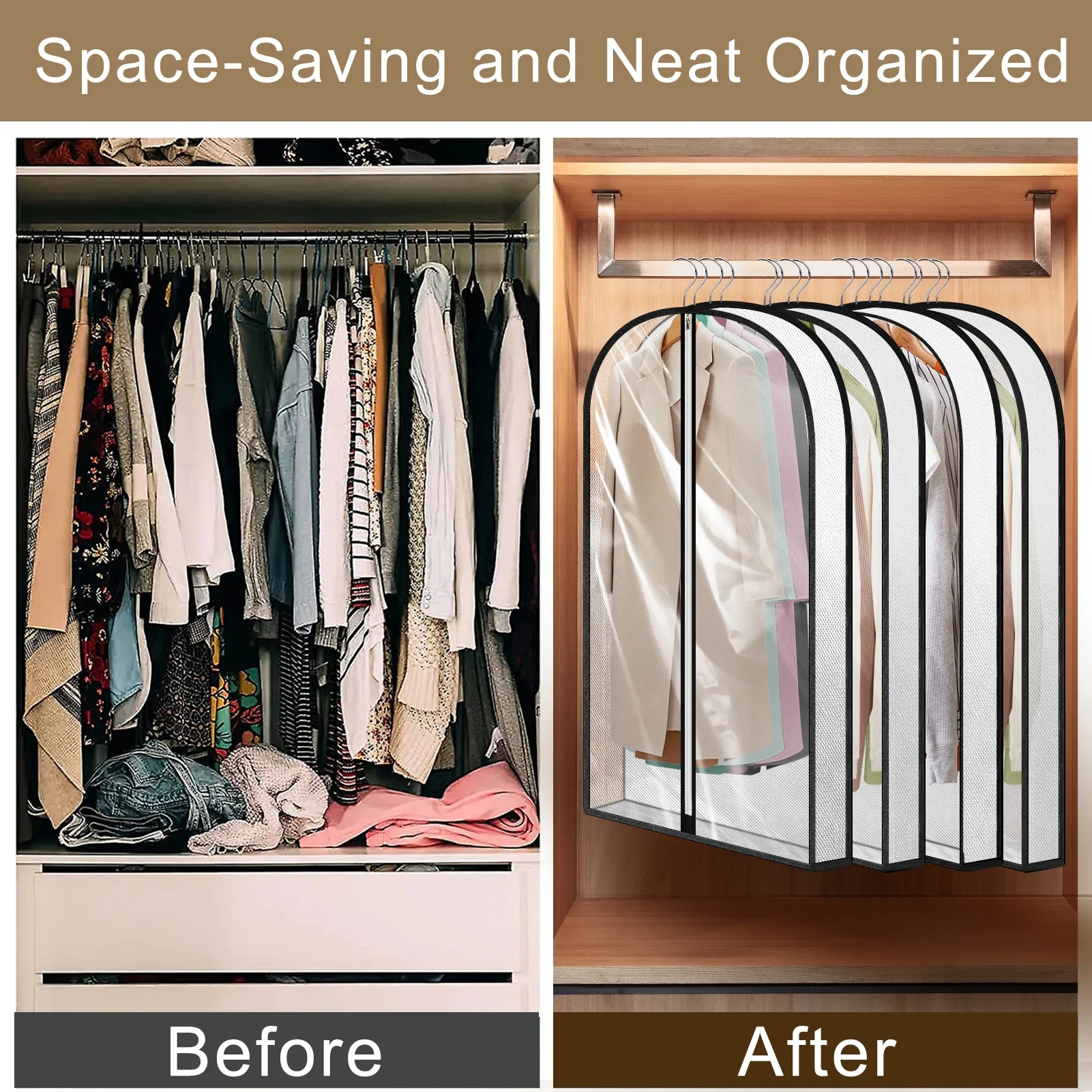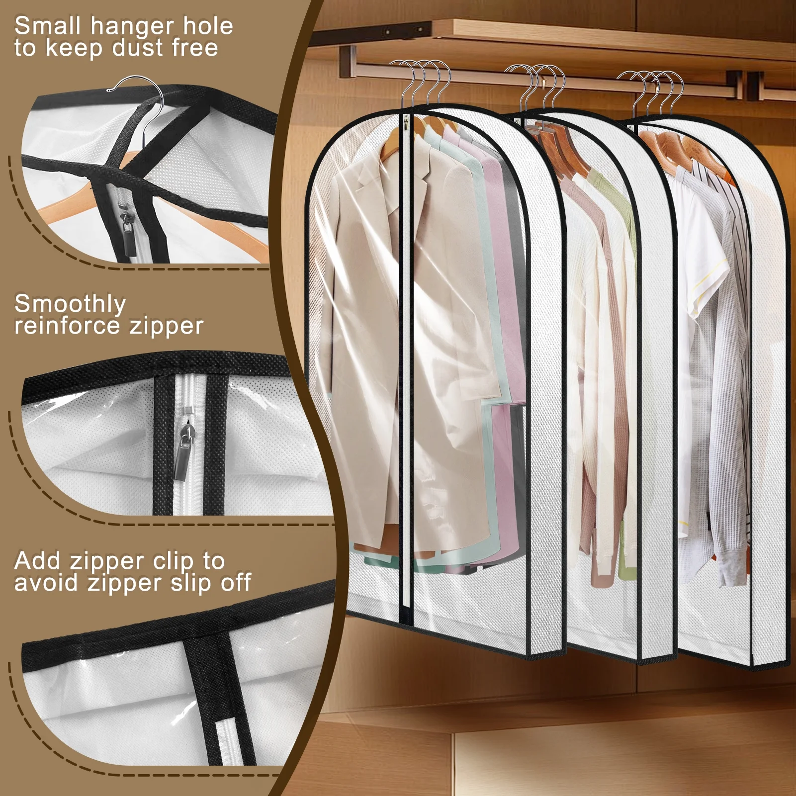 • Secure Hanging: Small top holes allow hanger hooks to pass through, fitting snugly over hangers for better dust protection and maintaining clothes’ integrity.